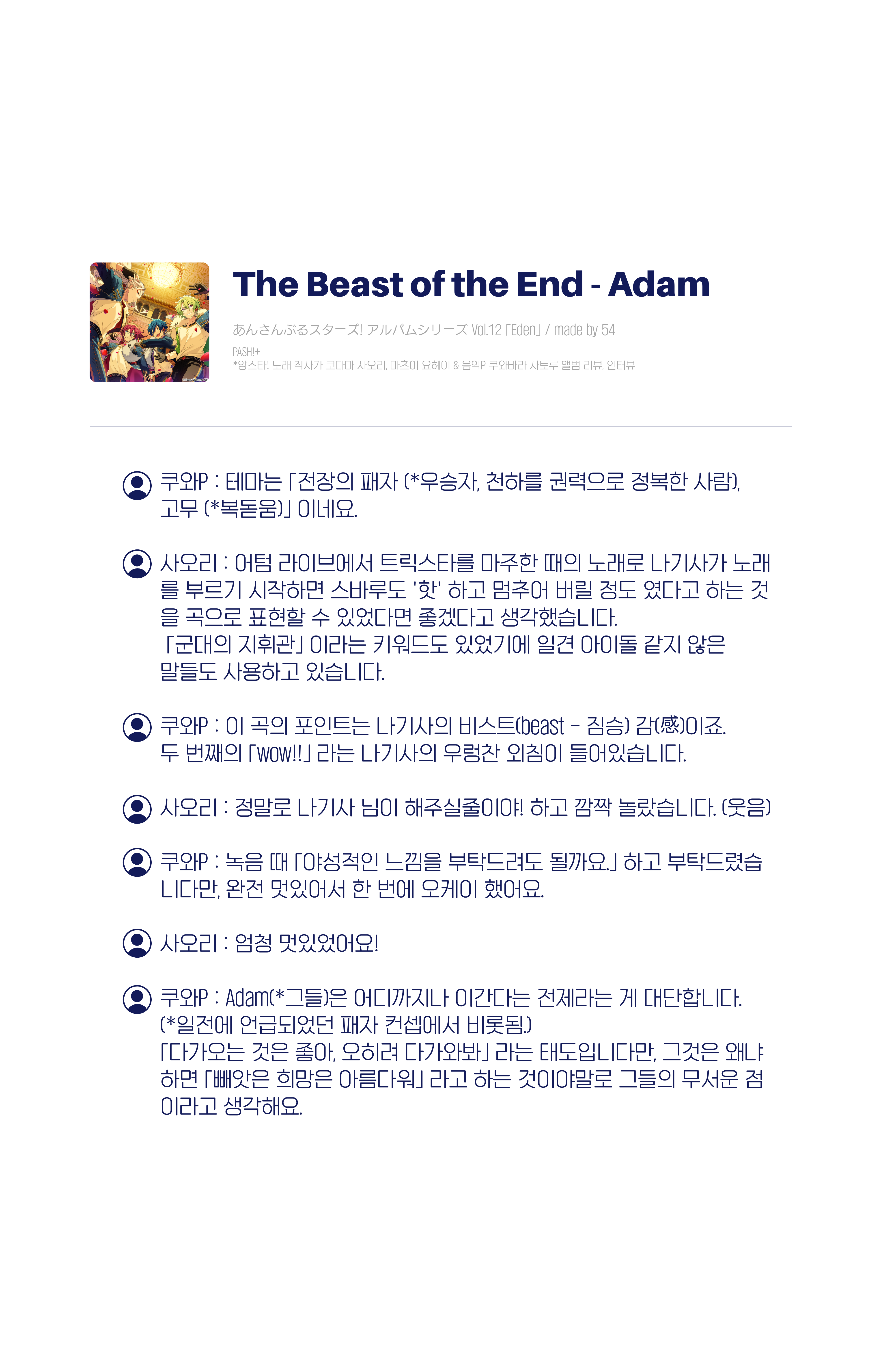 ์ฟ ์P : ์ด ๊ณก์ ํฌ์ธํธ๋ ๋๊ธฐ์ฌ์ ๋น์คํธ(beast - ์ง์น) ๊ฐ(ๆ)์ด์ฃ . ๋ ๋ฒ์งธ์ ใwow!!ใ ๋ผ๋ ๋๊ธฐ์ฌ์ ์ฐ๋ ์ฐฌ ์ธ์นจ์ด ๋ค์ด์์ต๋๋ค.