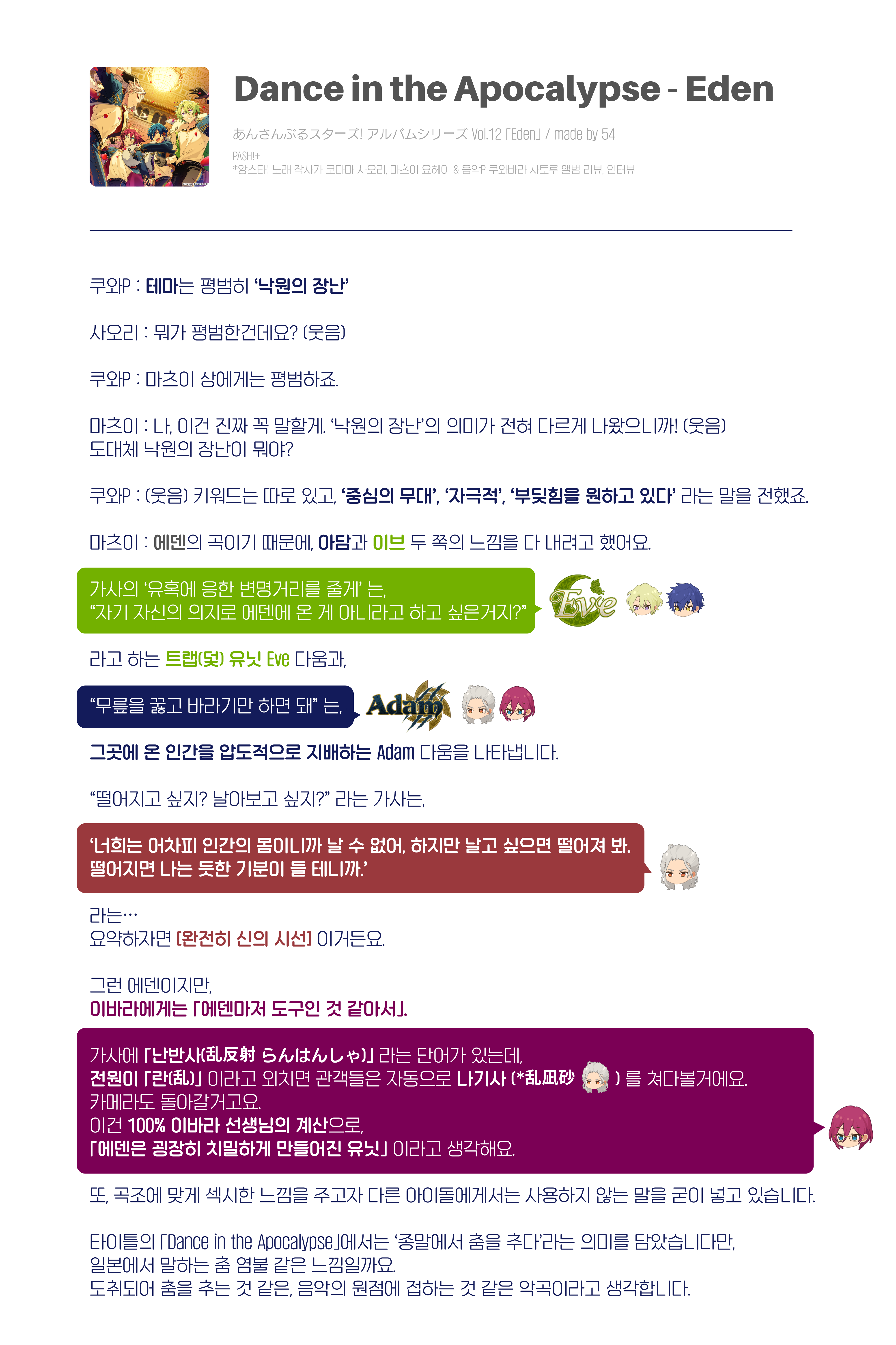 ํ์ดํ์ ใDance in the Apocalypseใ์์๋ ‘์ข ๋ง์์ ์ถค์ ์ถ๋ค’๋ผ๋ ์๋ฏธ๋ฅผ ๋ด์์ต๋๋ค๋ง, ์ผ๋ณธ์์ ๋งํ๋ ์ถค ์ผ๋ถ ๊ฐ์ ๋๋์ผ๊น์. ๋์ทจ๋์ด ์ถค์ ์ถ๋ ๊ฒ ๊ฐ์, ์์ ์ ์์ ์ ์ ํ๋ ๊ฒ ๊ฐ์ ์ ๊ณก์ด๋ผ๊ณ ์๊ฐํฉ๋๋ค.